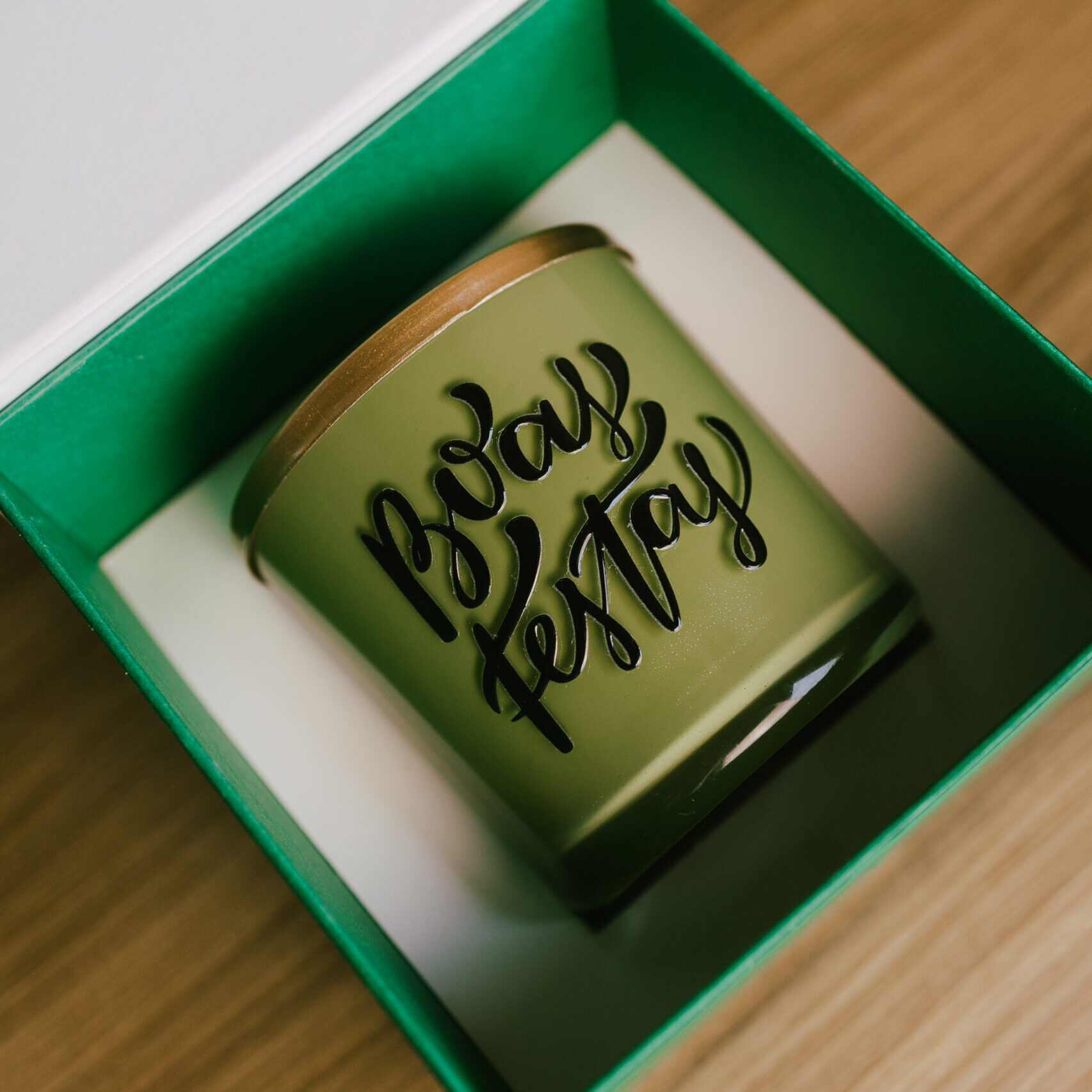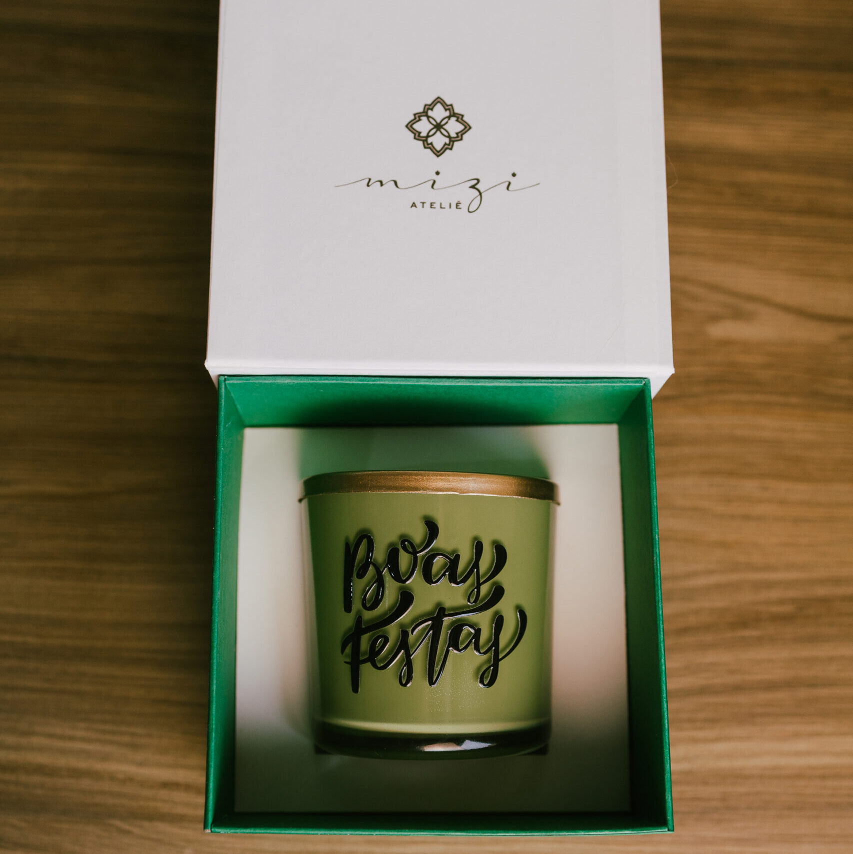 Apresentamos a nossa Vela 180g em um copo de vidro verde com mensagem em alto relevo Boas Festas, com tampa dourada em uma caixa rígida cartonada com tampa imã no tamanho 12,5×12,5×9 para despertar suas memórias natalinas.