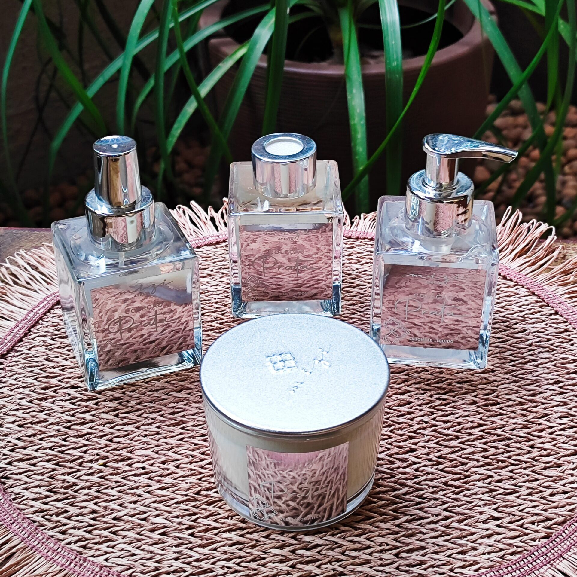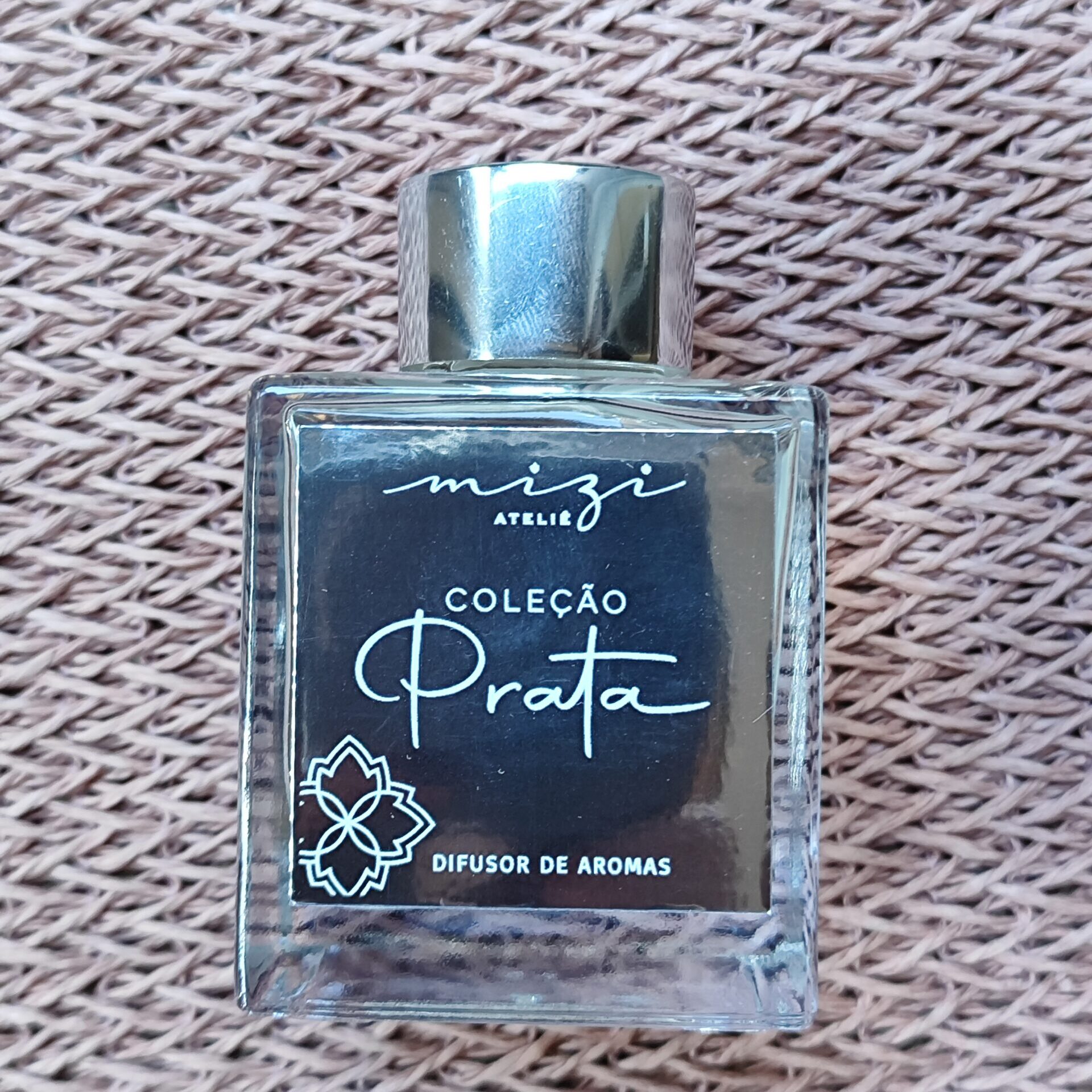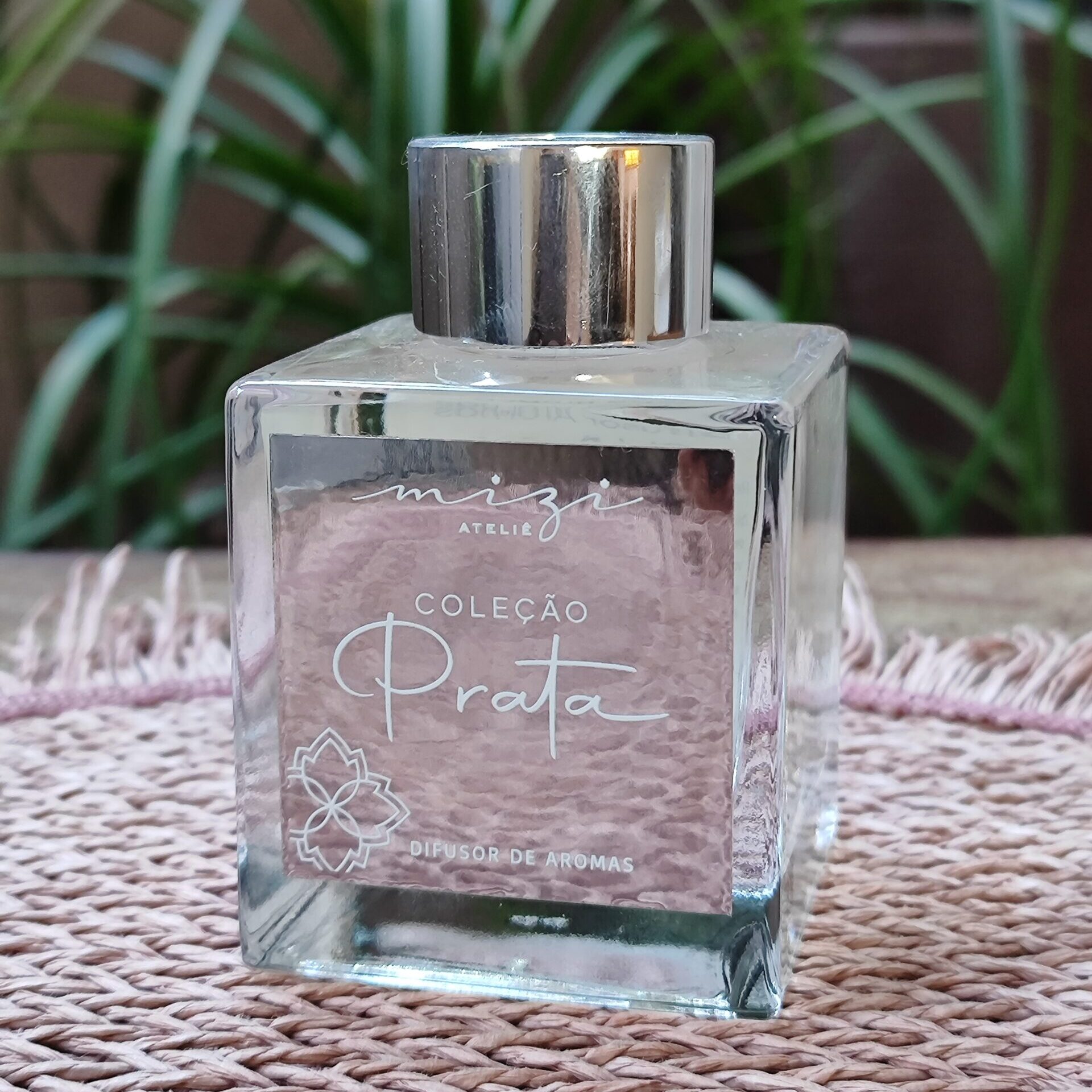 Apresentamos o nosso Difusor de 100 ml, em vidro no formato cubo quadrado, com tampa prata e etiqueta personalizada da Coleção Prata para perfumar sua casa com elegância