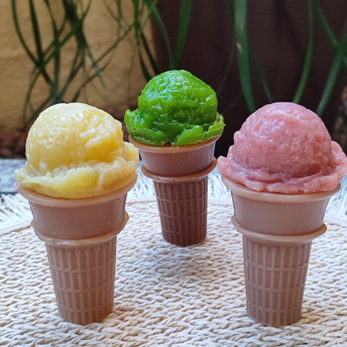 Os sabonetes em formatos de sorvete na casquinha, são produzidos com base glicerinada neutra, extrato glicerinado, lauril, essência de qualidade e corante para cosméticos, totalmente artesanal e sem conservantes.