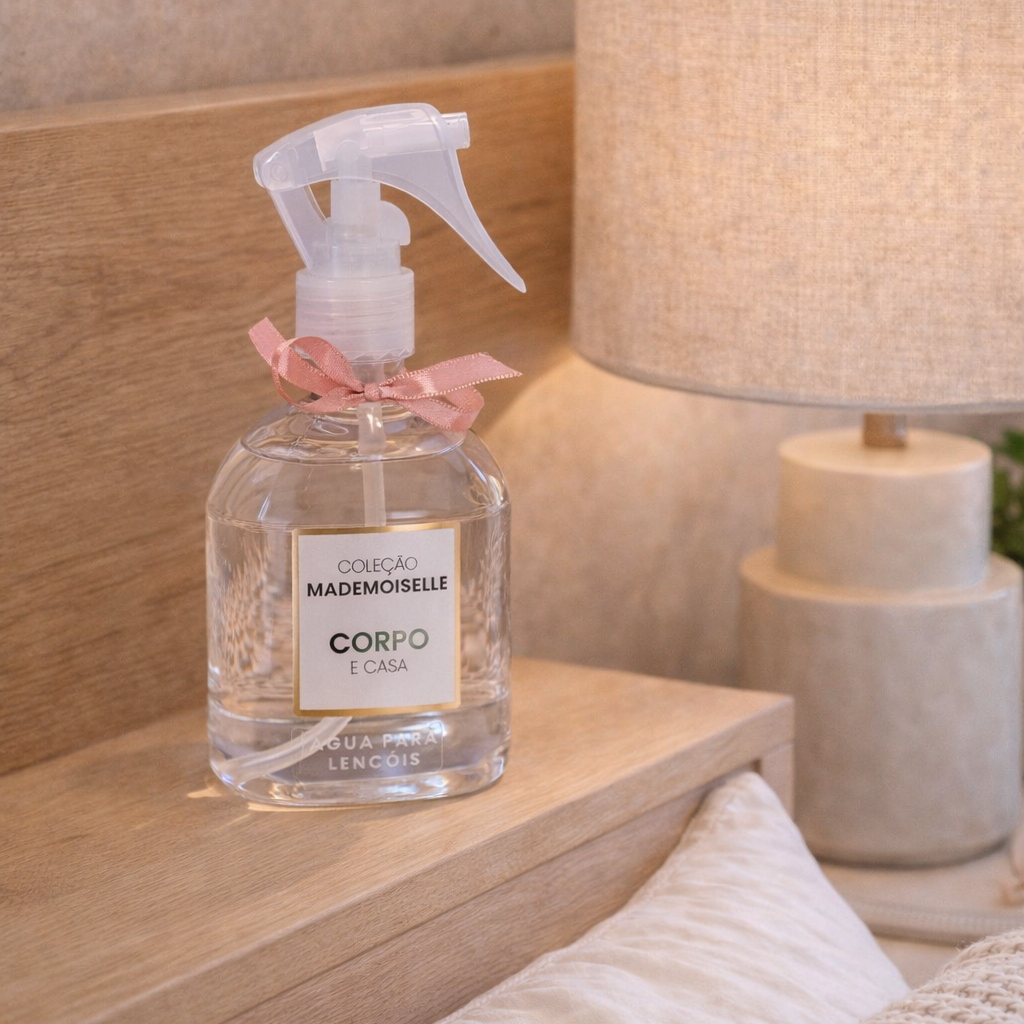 Apresentamos o nossa Água para Lençóis, cortinas, almofadas, sofás… de 250 ml, em frasco quadrado, com tampa spray transparente e etiqueta personalizada da Coleção Mademoiselle