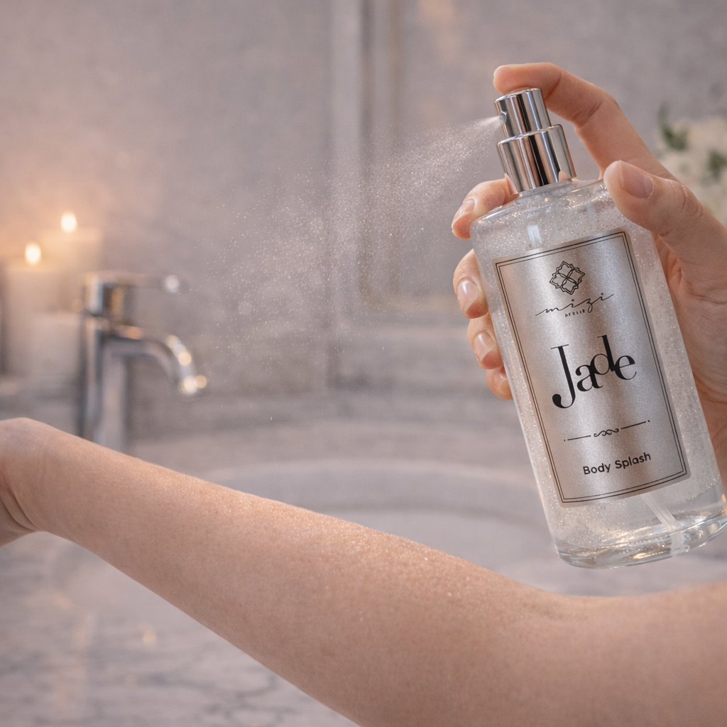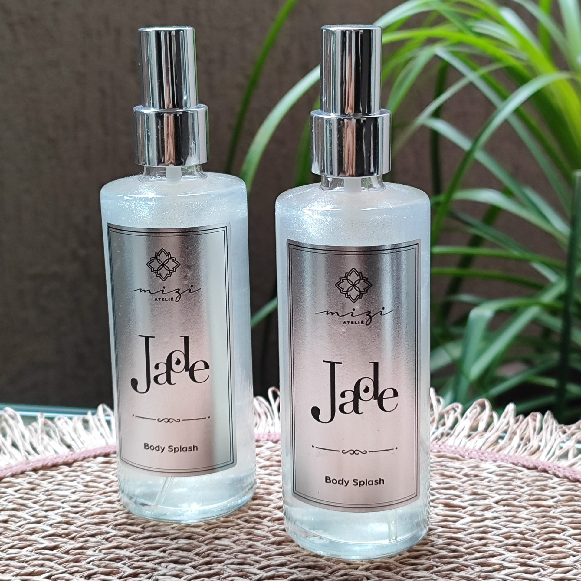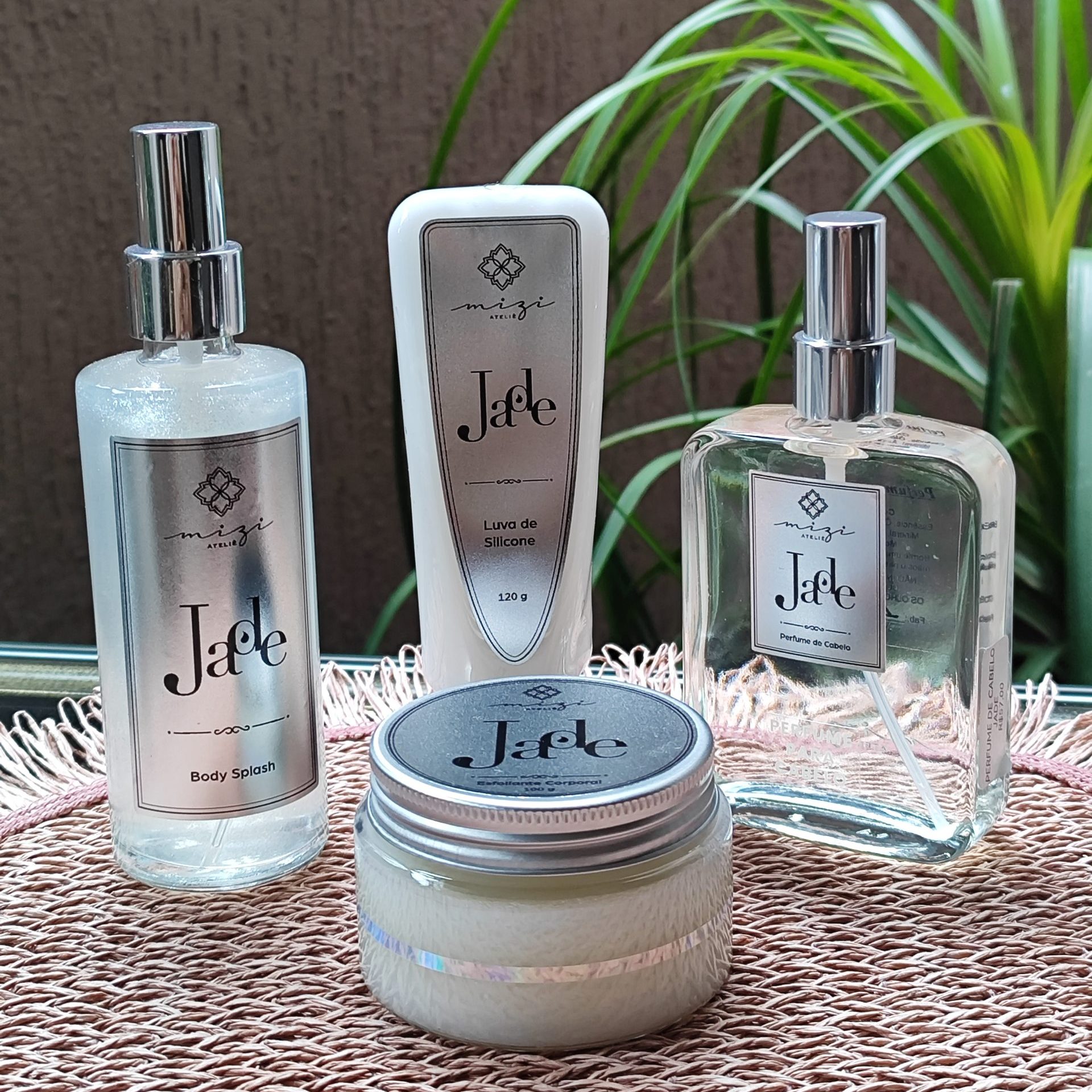 Apresentamos o nosso Body Splash Jade em um frasco de vidro cilíndrico lindíssimo e tampa prateada, com etiqueta personalizada da Coleção Jade, para compor com elegância seu kit cuidado corporal.
