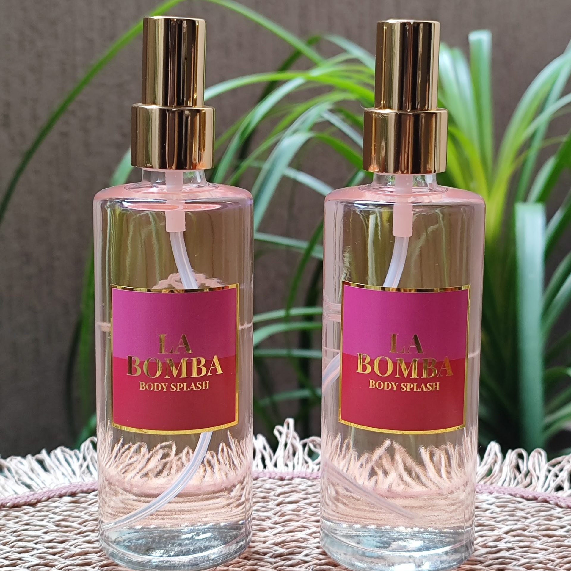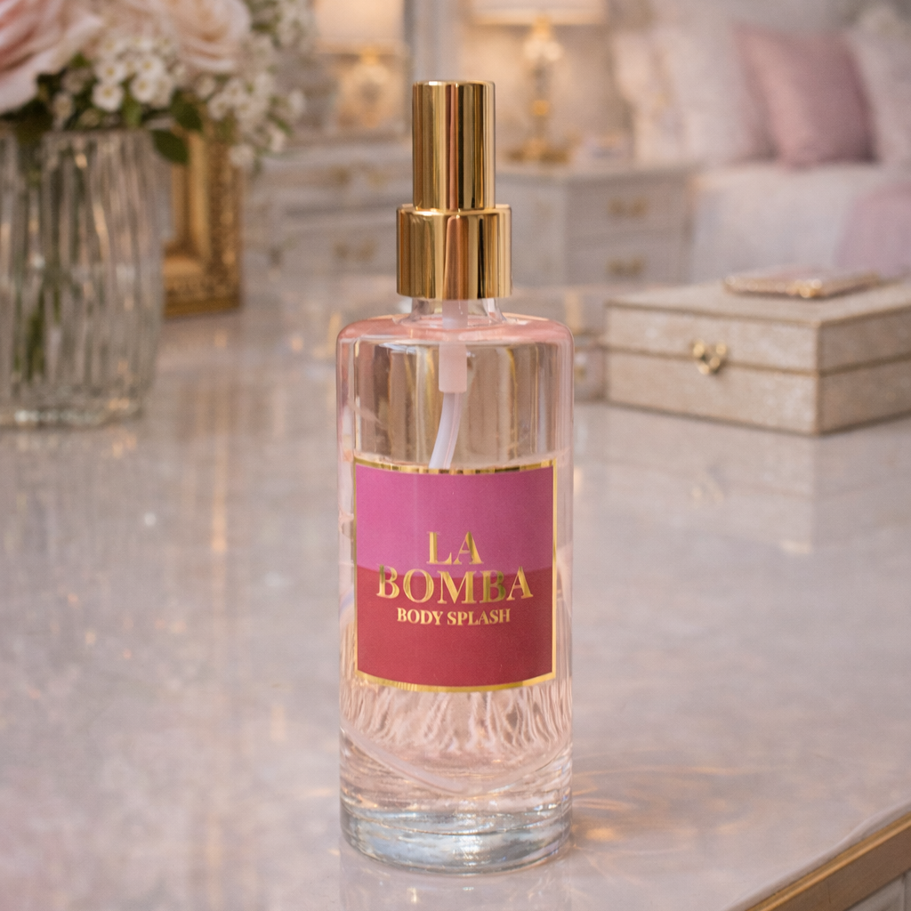 Apresentamos o nosso Body Splash La Bomba em um frasco de vidro cilíndrico lindíssimo e tampa dourada, com etiqueta personalizada da Coleção La Bomba, para compor com elegância seu kit cuidado corporal.