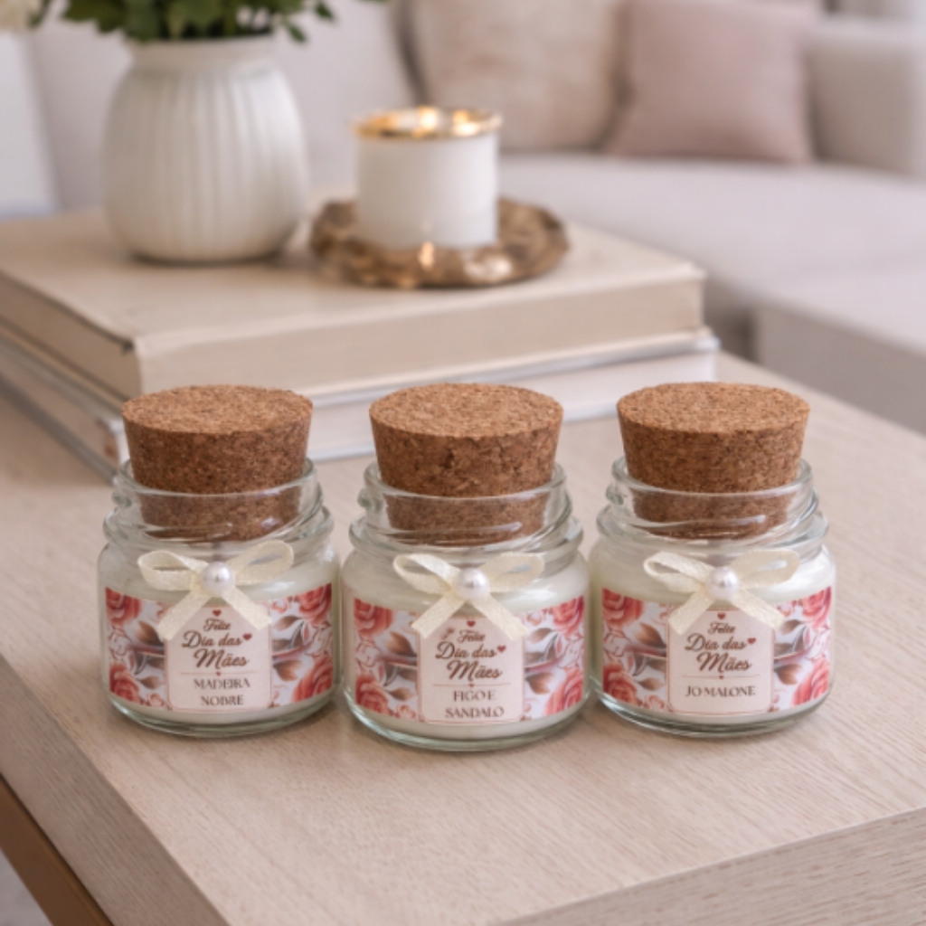 Cera vegetal aromática, essência premium, pavio de algodão e recipientes de vidro estilo geleia.