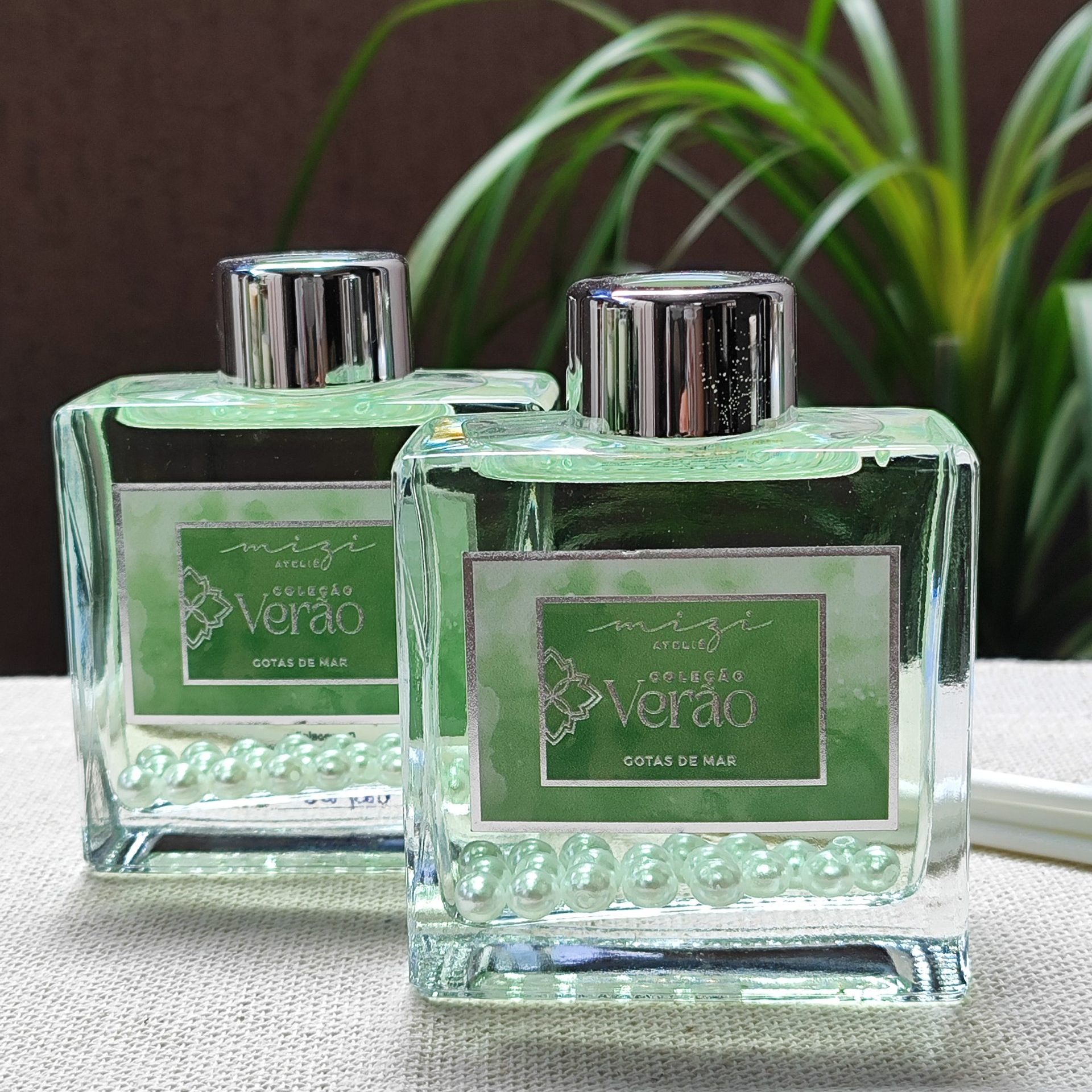 Apresentamos o nosso Difusor de 100 ml, em vidro no formato quadrado, com tampa prata e etiqueta personalizada da Coleção Verão para perfumar sua casa com elegância
