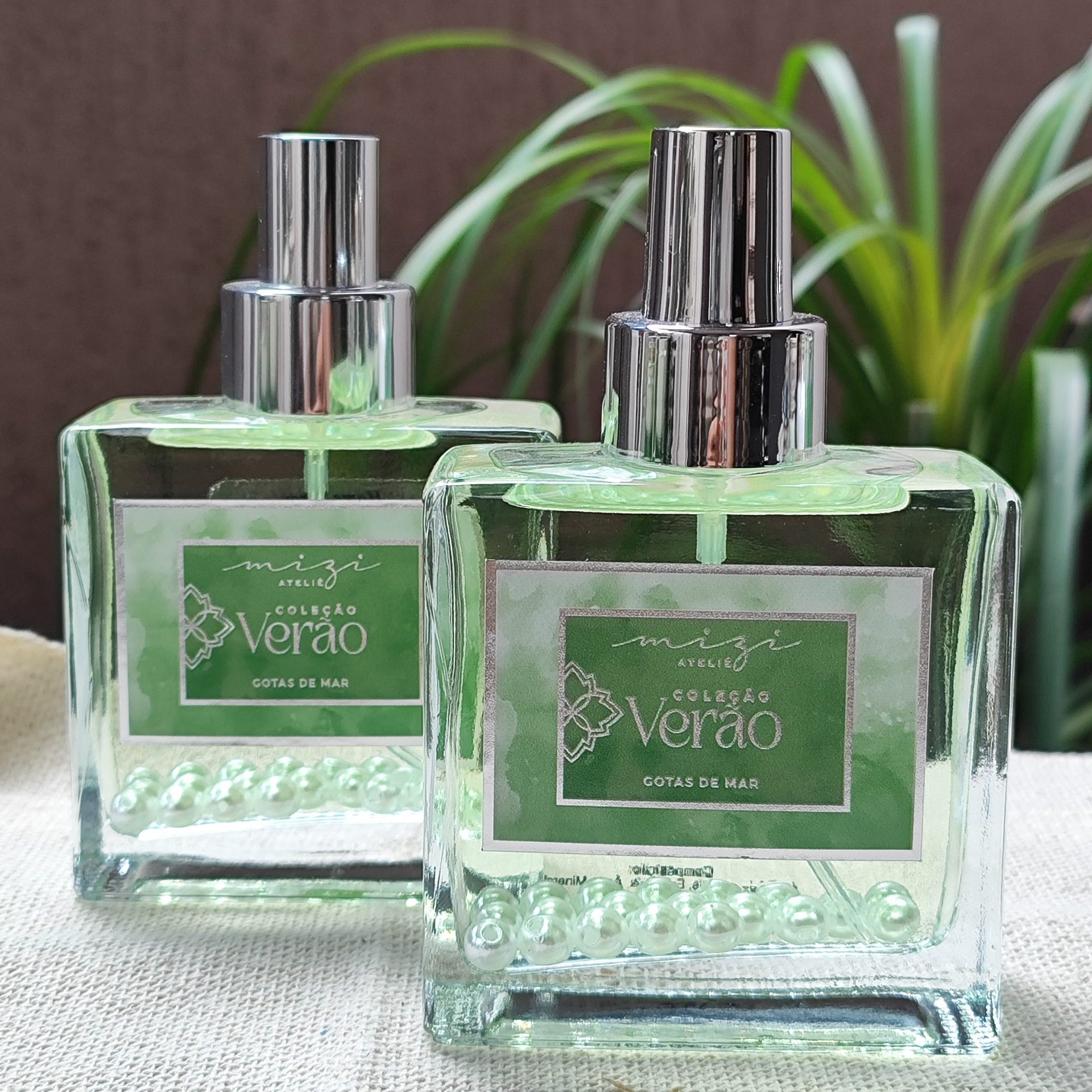 Apresentamos o nosso Home Spray de 100 ml, em vidro no formato quadrado, com tampa prata e etiqueta personalizada da Coleção Verão para perfumar sua casa com elegância