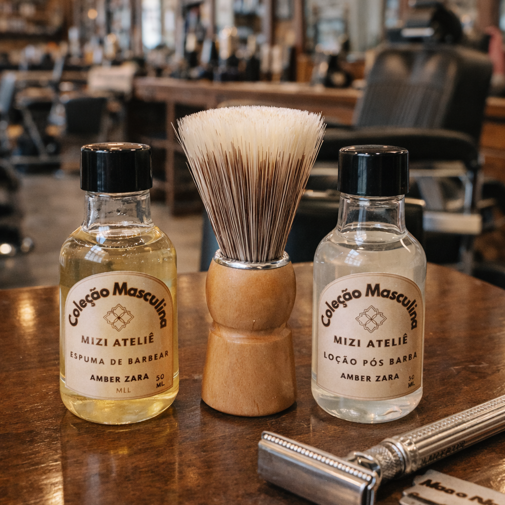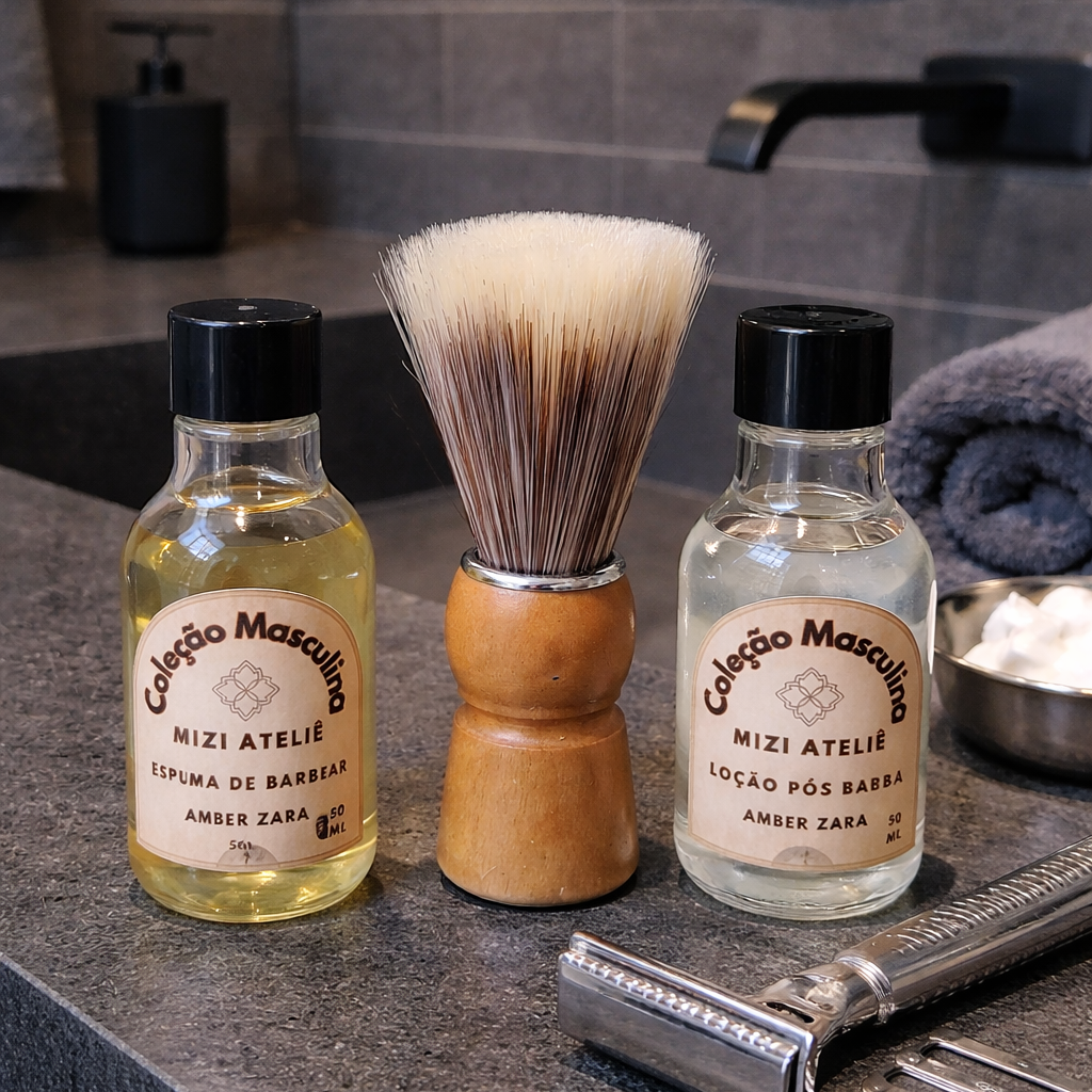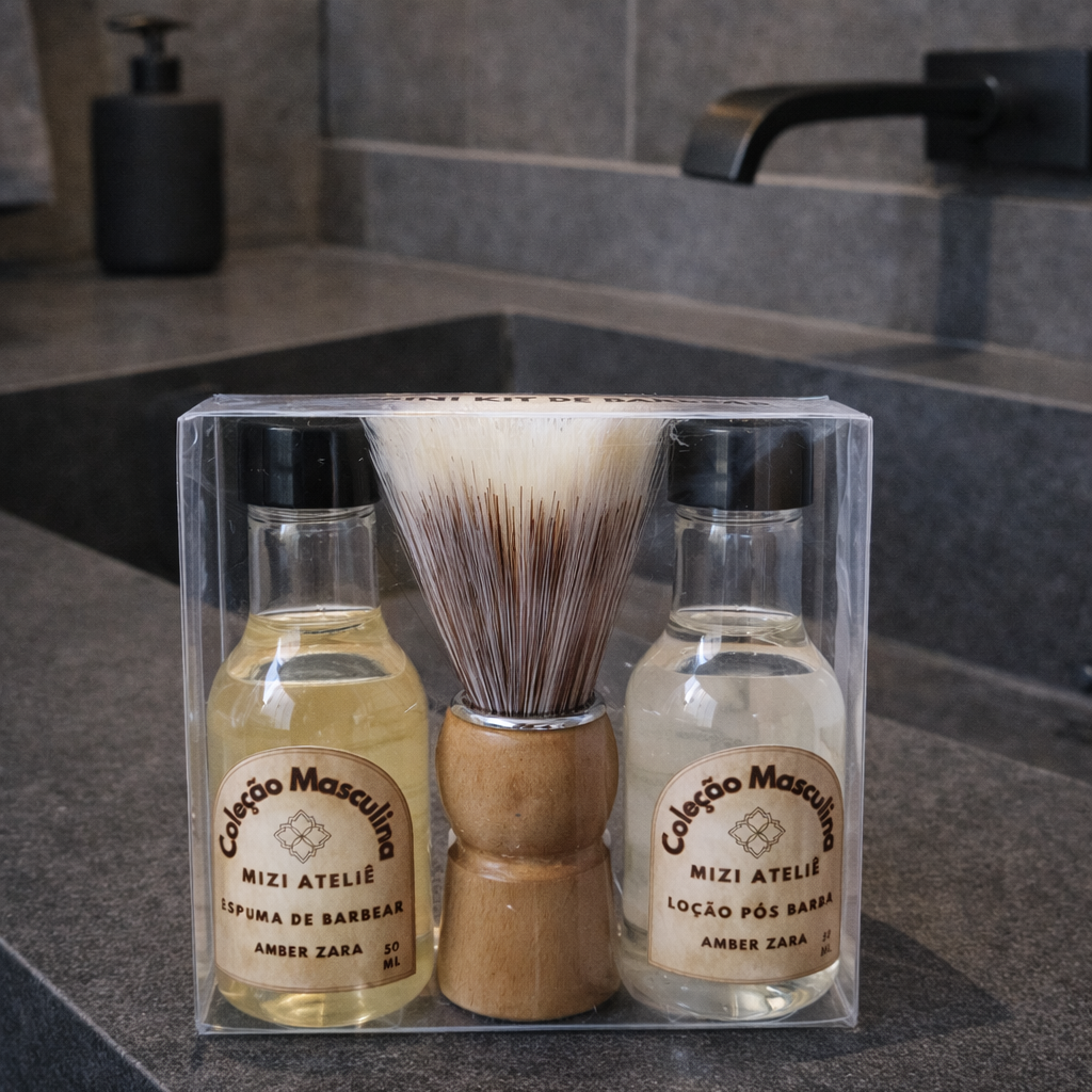 Elegância no Mini Kit de Barbear em frascos formato garrafinha. Aroma masculino e hidratação para seu barbear. Encontre na Loja Mizi Ateliê e curta seu momento de cuidado pessoal.