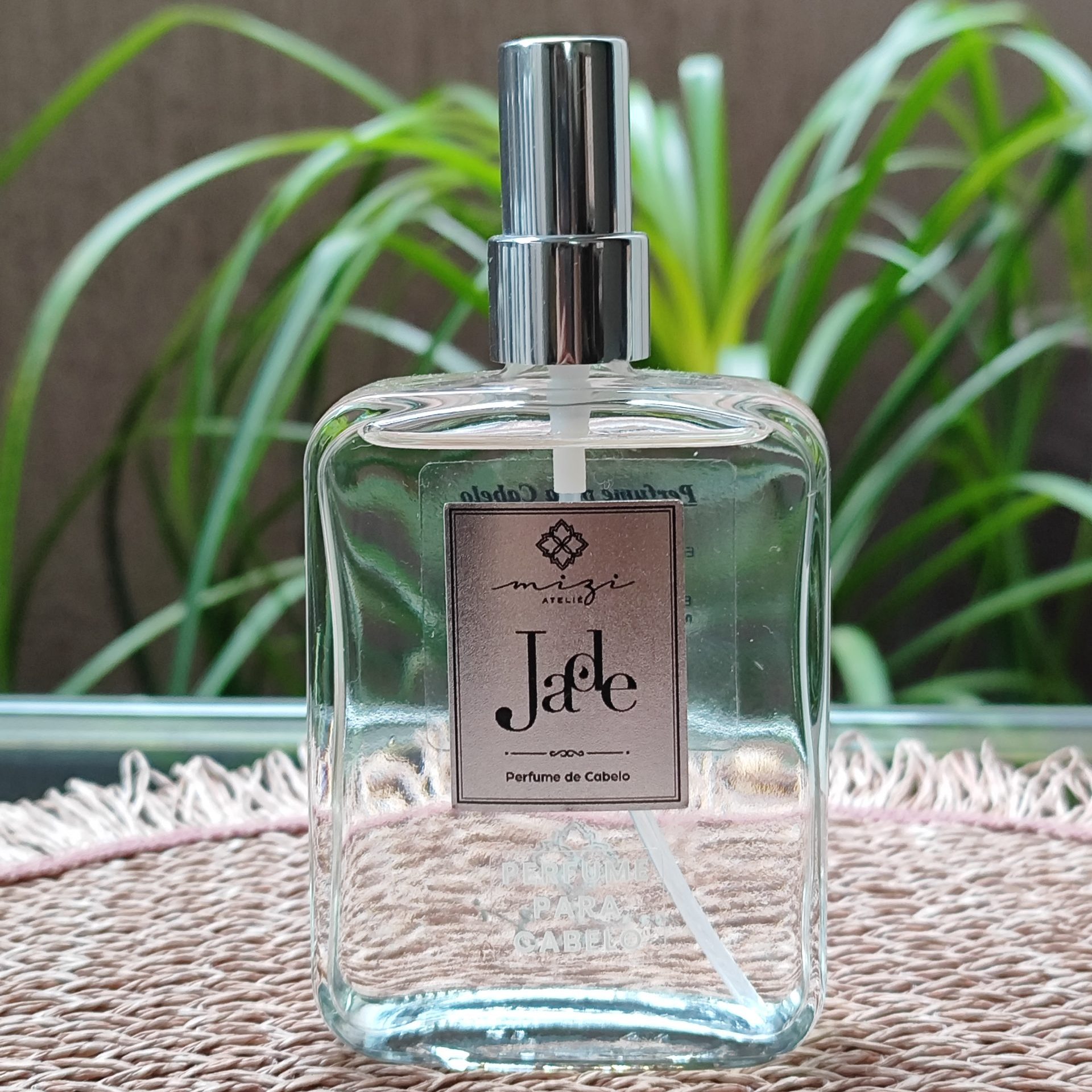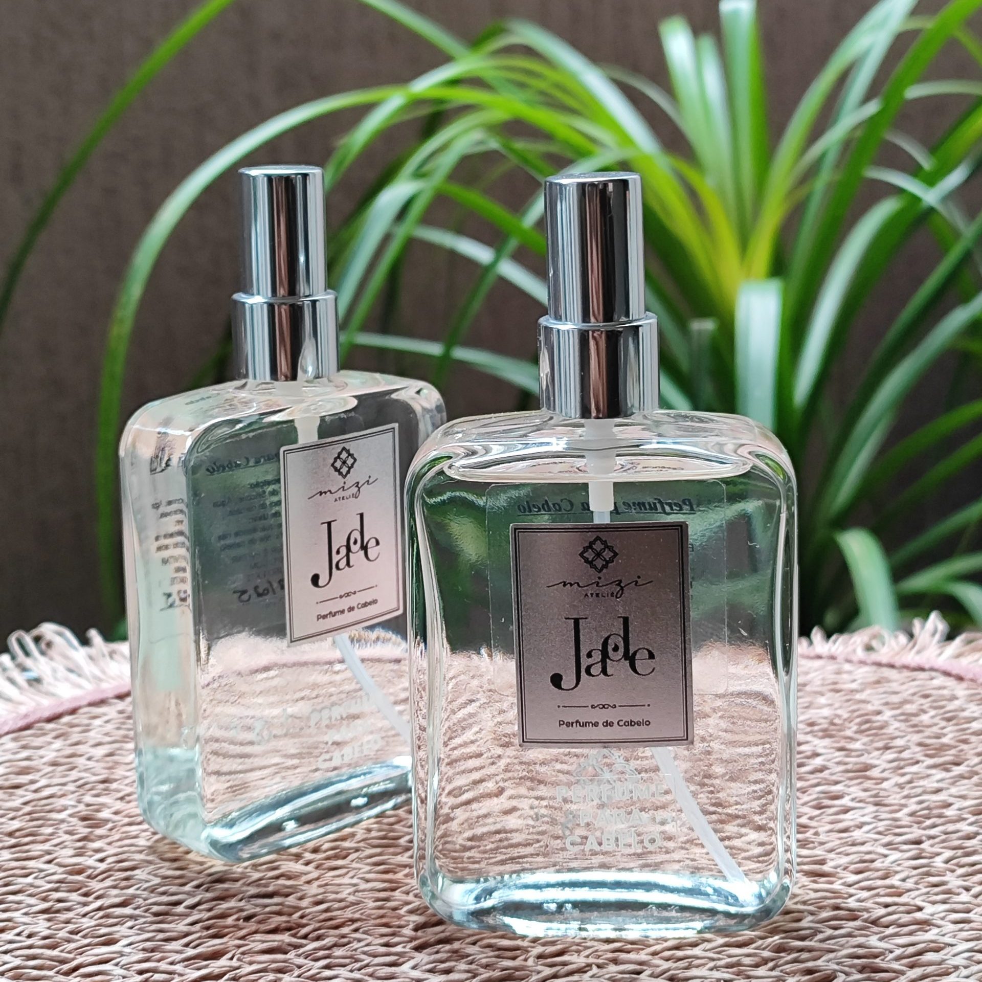 Apresentamos o nosso Perfume para Cabelo 100 ml, em vidro formato Chanel, com tampa prata e etiqueta personalizada Jade, para compor com elegância sua prateleira de aromas.