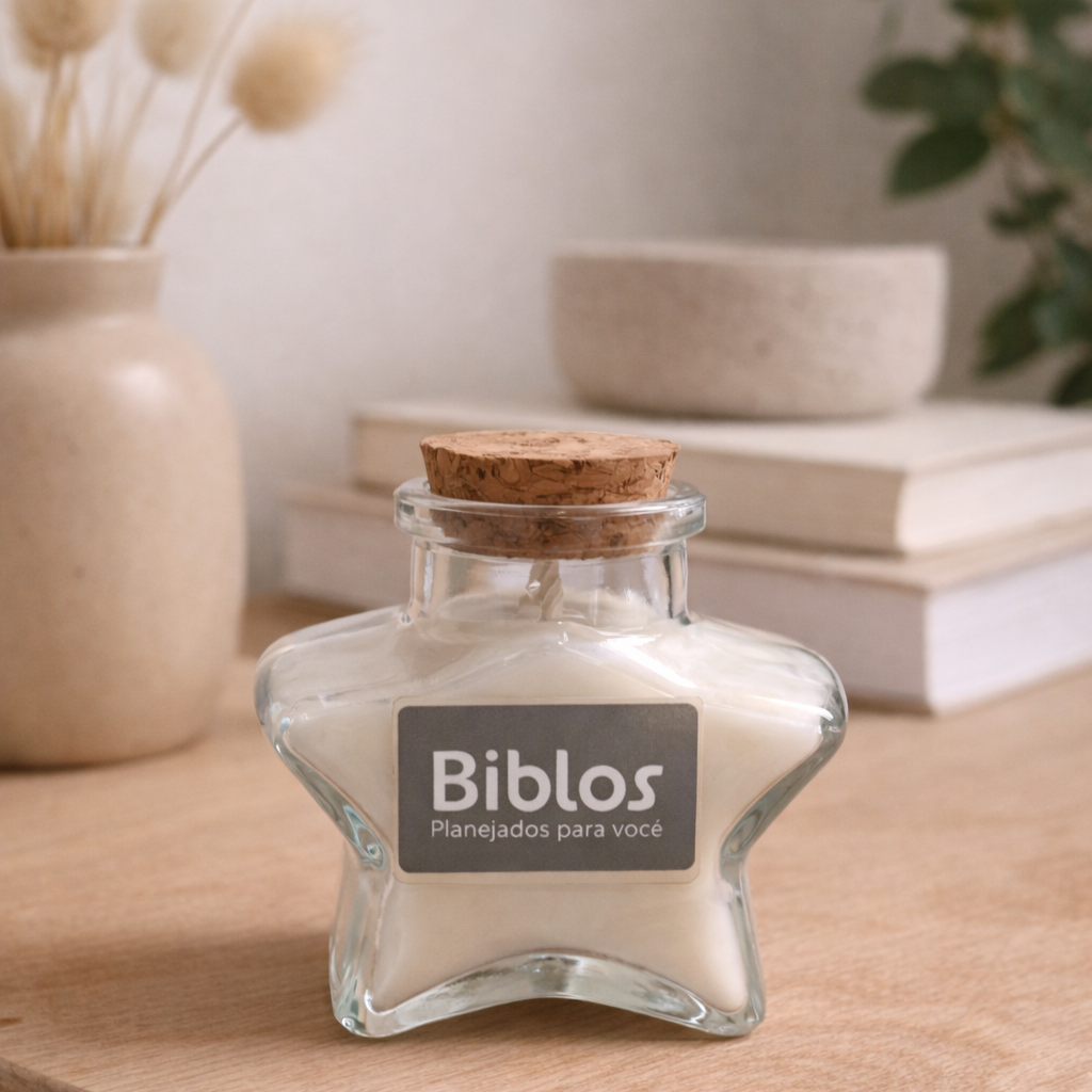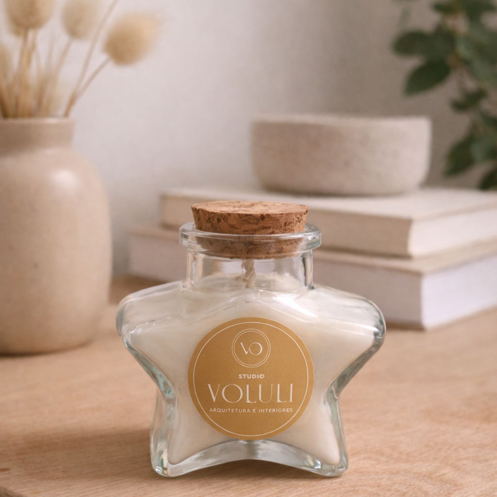 Vela com tampa rolha e vidro modelo estrela com etiqueta personalizada