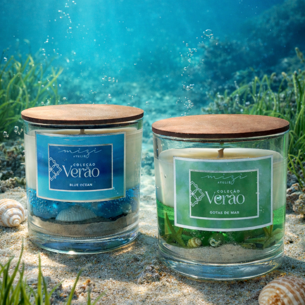Na Loja Mizi Ateliê, apresentamos nossa Vela Fundo do Mar, uma verdadeira submersão ao fundo do mar. Esta vela, delicadamente acondicionada em vidro transparente, é um presente encantador para celebrar sentimentos especiais.