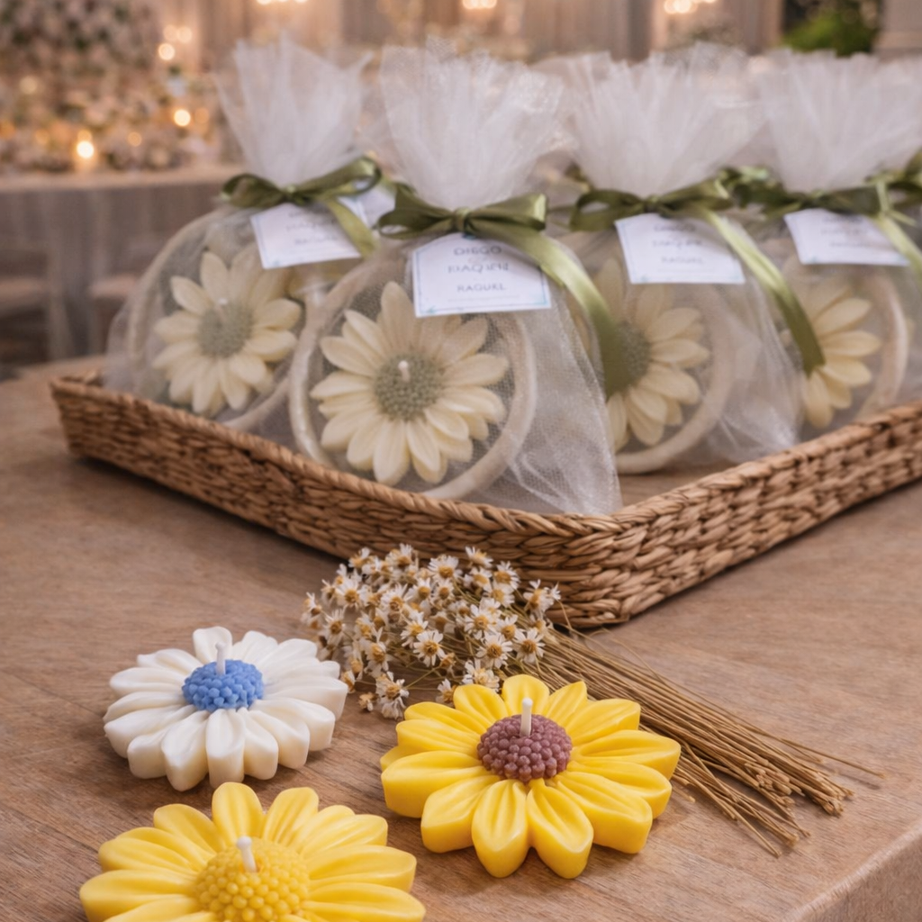 Apresentamos a nossa Vela Margarida com 15g embalada com tule ou organza e laço de cetim para presentear, ou personalizada para lembrancinha de casamento.